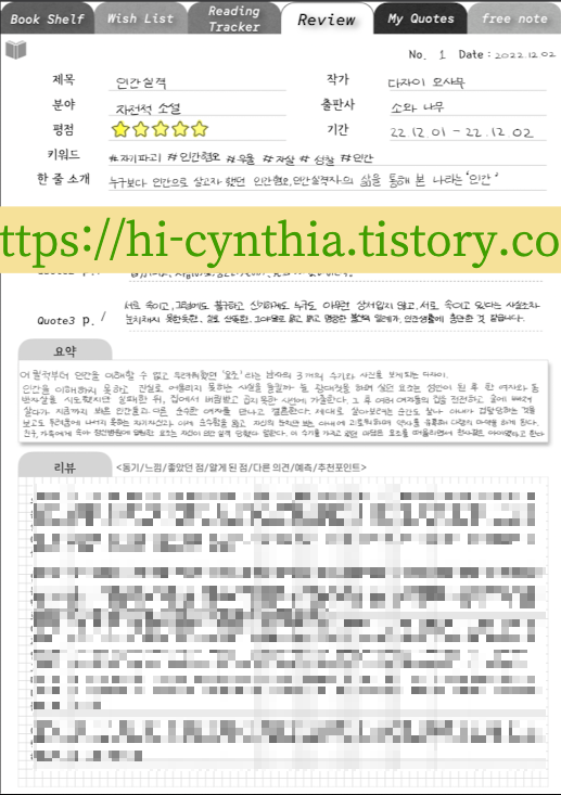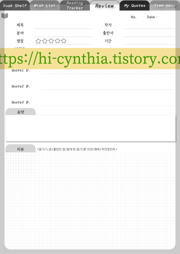 책 표지는 앞에 넣었으니까 자리만 차지할 것 같아서 뺐다. 책 읽은 기간도 글쎄, 크게 필요해 보이지는 않지만 칸이 남아 구실 맞추는 격 ㅋ